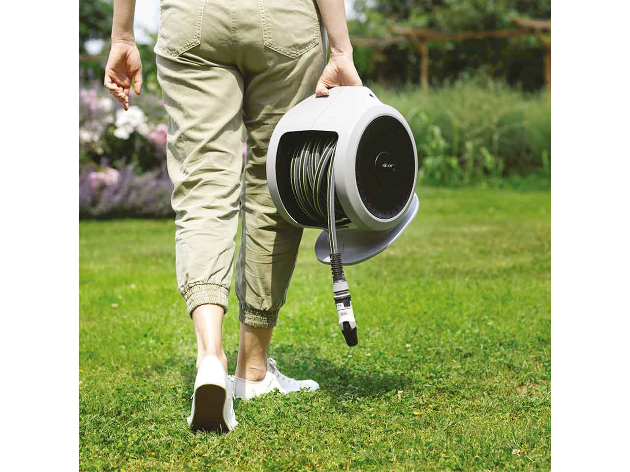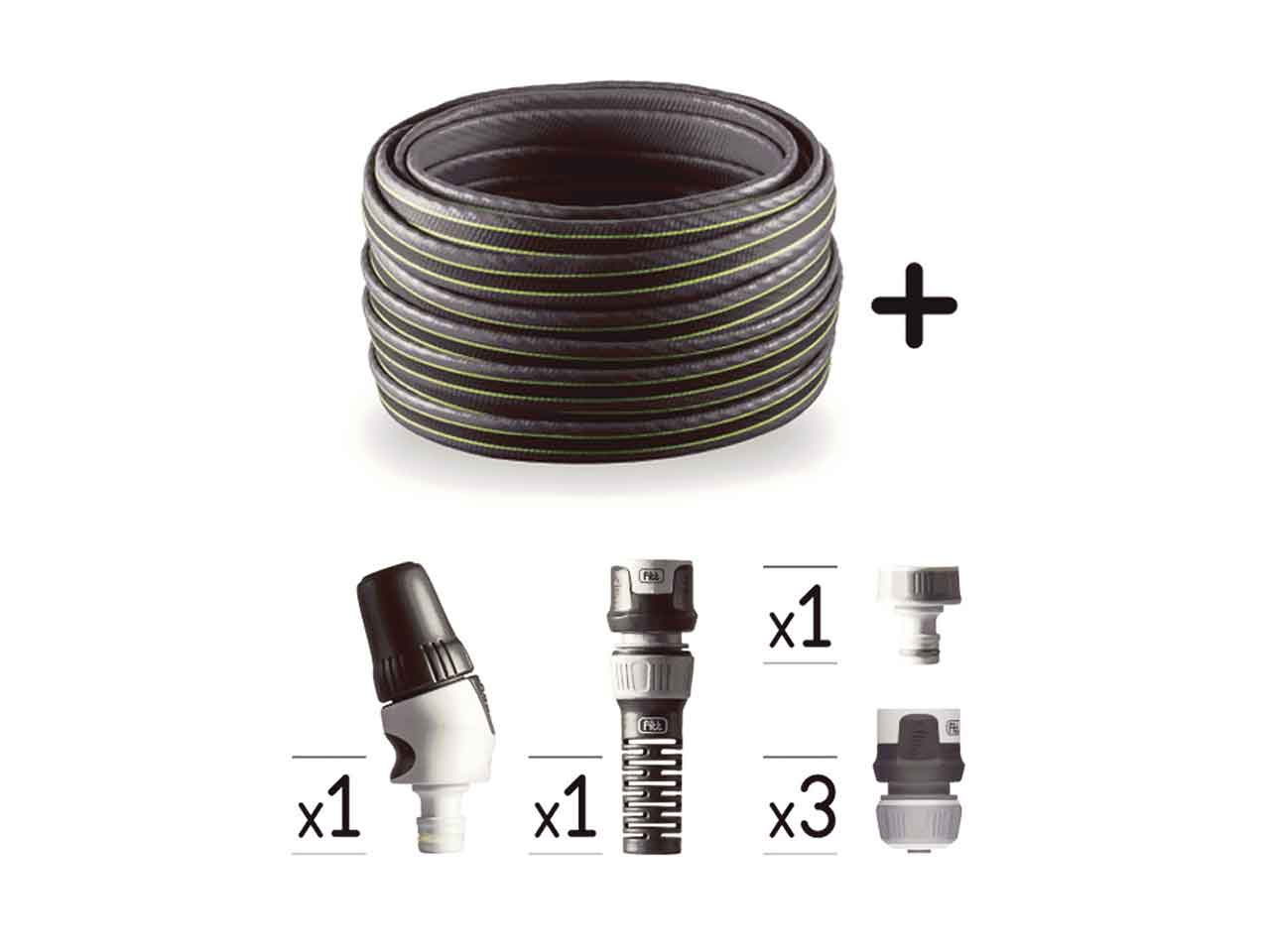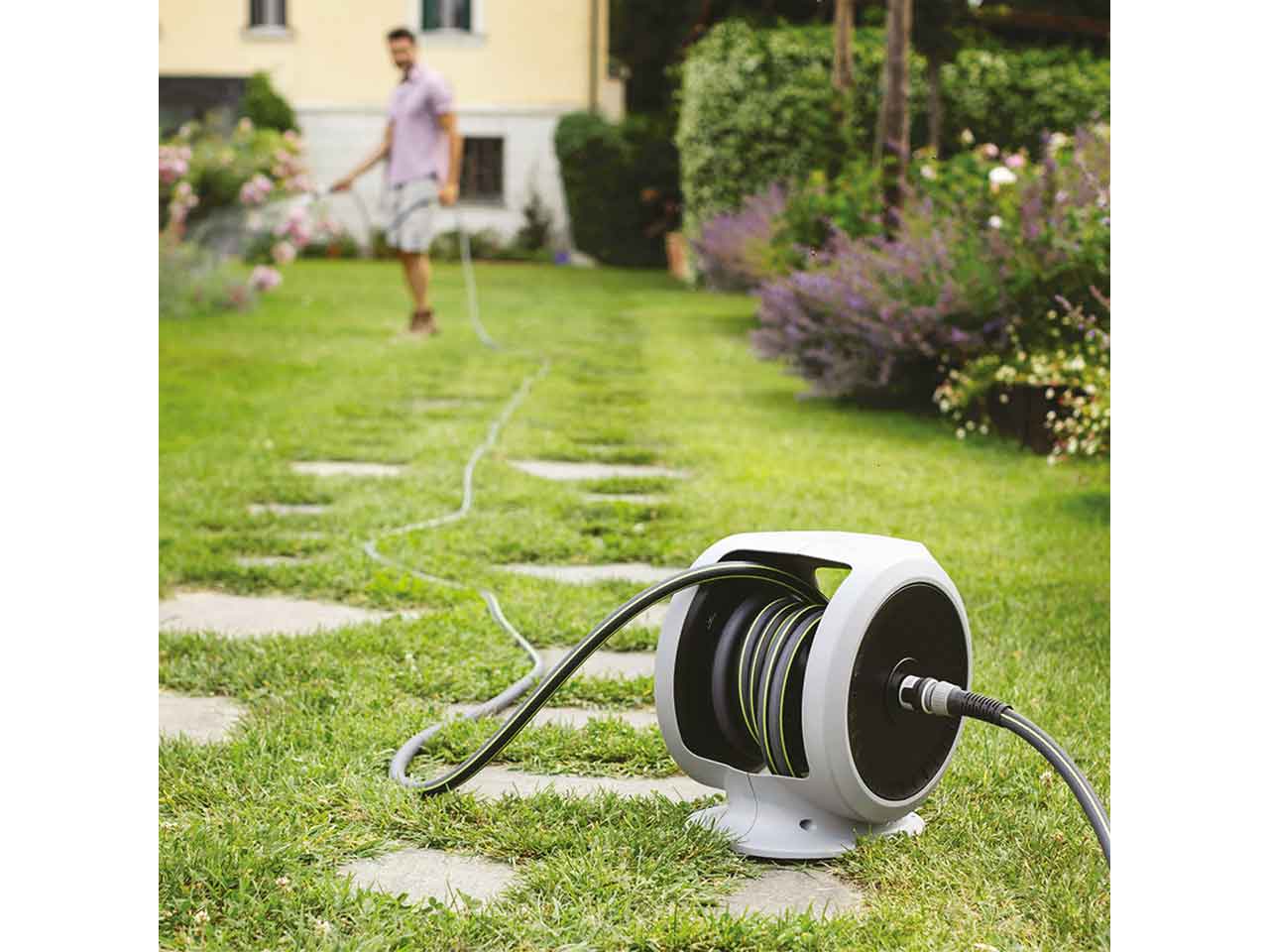 >Enrollador de manguera con manguera FITT Force. La manguera FITT Force cuando no esta en uso queda plana y se aloja perfectamente en el interior. Cuando se abre el grifo, la manguera se llena de agua y asume la clásica forma redonda. Cuando se cierra el grifo, la manguera se aplana y el mecanismo vuelve a la posición inicial manteniendo FITT Force perfectamente recogida. CARACTERÍSTICAS: Compacta. Ligera. Posibilidad anclaje pared. ELEMENTOS INCLUIDOS: 1 Manguera FITT Force de 20m. 4 Racores. 1 Lanza. 1 Adaptador grifo.