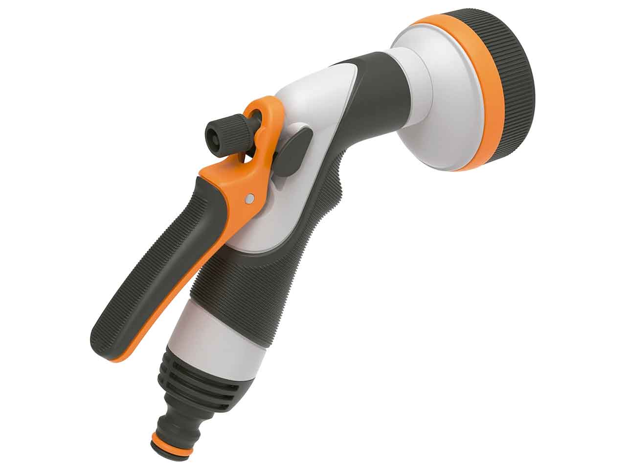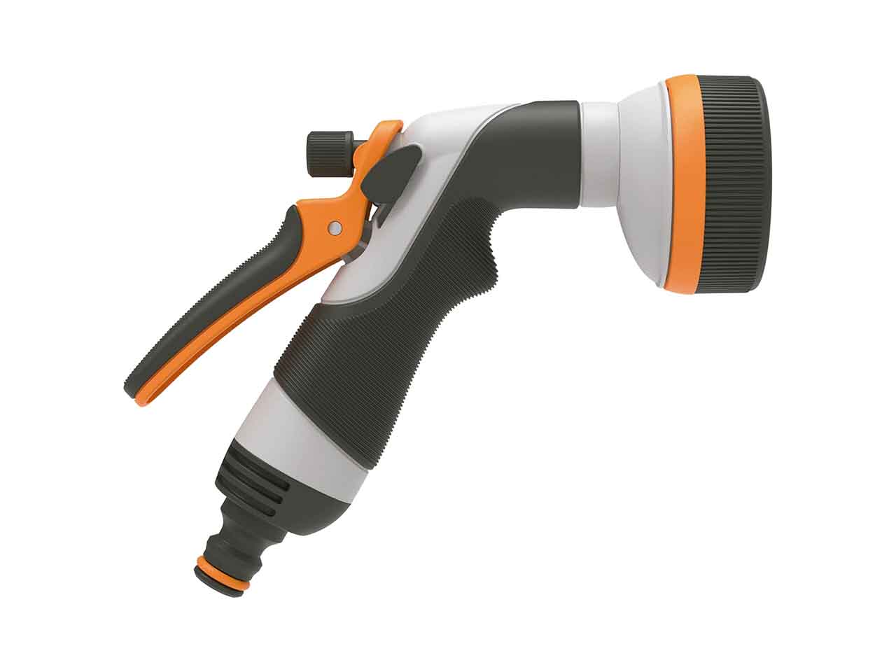 >Permite seleccionar 8 tipos de chorro diferentes simplemente girando el anillo frontal. Mango cubierto con goma suave antideslizante. Palanca de ajuste trasera para bloquear el chorro. Caudal máximo 10 l / min a 4 bar