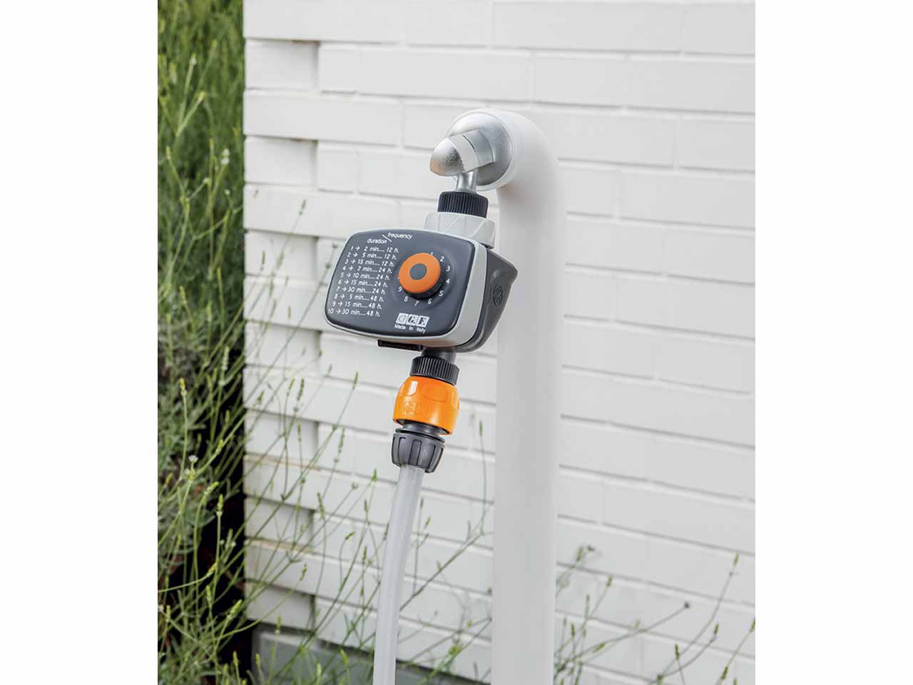 >Selector 10 programas. Posición manual para apertura y cierre electroválvula fuera de los ciclos de programación. Funciona con pila alcalina de 9 voltios. Dispositivo de parada del flujo de agua en caso de agotamiento de la batería. Conexión al grifo de 3/4. Presión máxima de uso: 8 bar