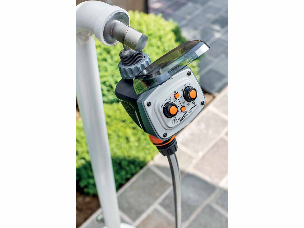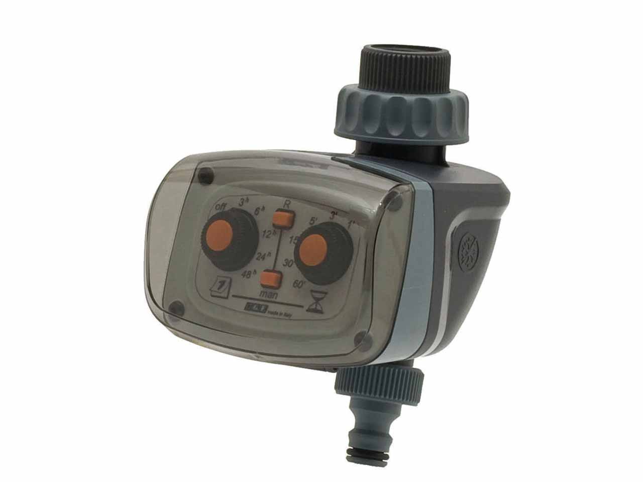 >Hasta 30 posibilidades, manejables a través de los dos interruptores giratorios de fácil uso. Arranques cada 3, 6, 12, 24, 48 horas, durante 1, 3, 5, 15, 30, 60 minutos. Tecla para arranques manuales fuera de los ciclos de programación. Tecla para arranque diferido de 8 horas tras el ajuste inicial. Funciona con pila alcalina de 9 voltios. Dispositivo de corte del flujo de agua en caso de agotamiento de la pila. Componentes eléctricos protegidos contra el agua y la humedad. Conexión de grifo de ¾. Presión máxima de funcionamiento 8 bar
