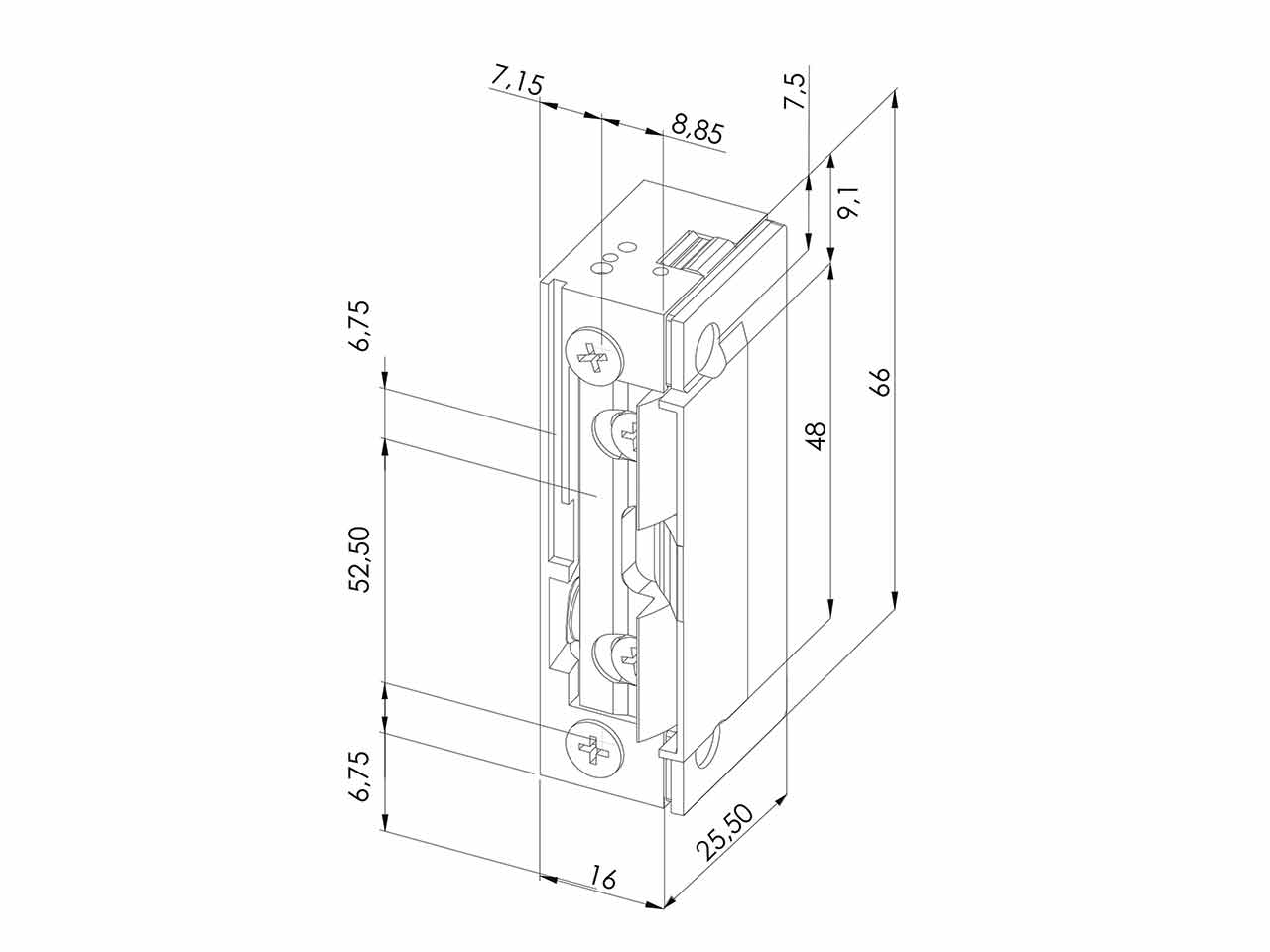 >Nuevo sistema con rampa de guiado del picaporte y tapa con sistema antigripado. Multivoltaje con funcionamiento en AC y DC. Reducidas dimensiones, con pestillo radial, simetrico y reversible. Certificación UNE EN 14846.