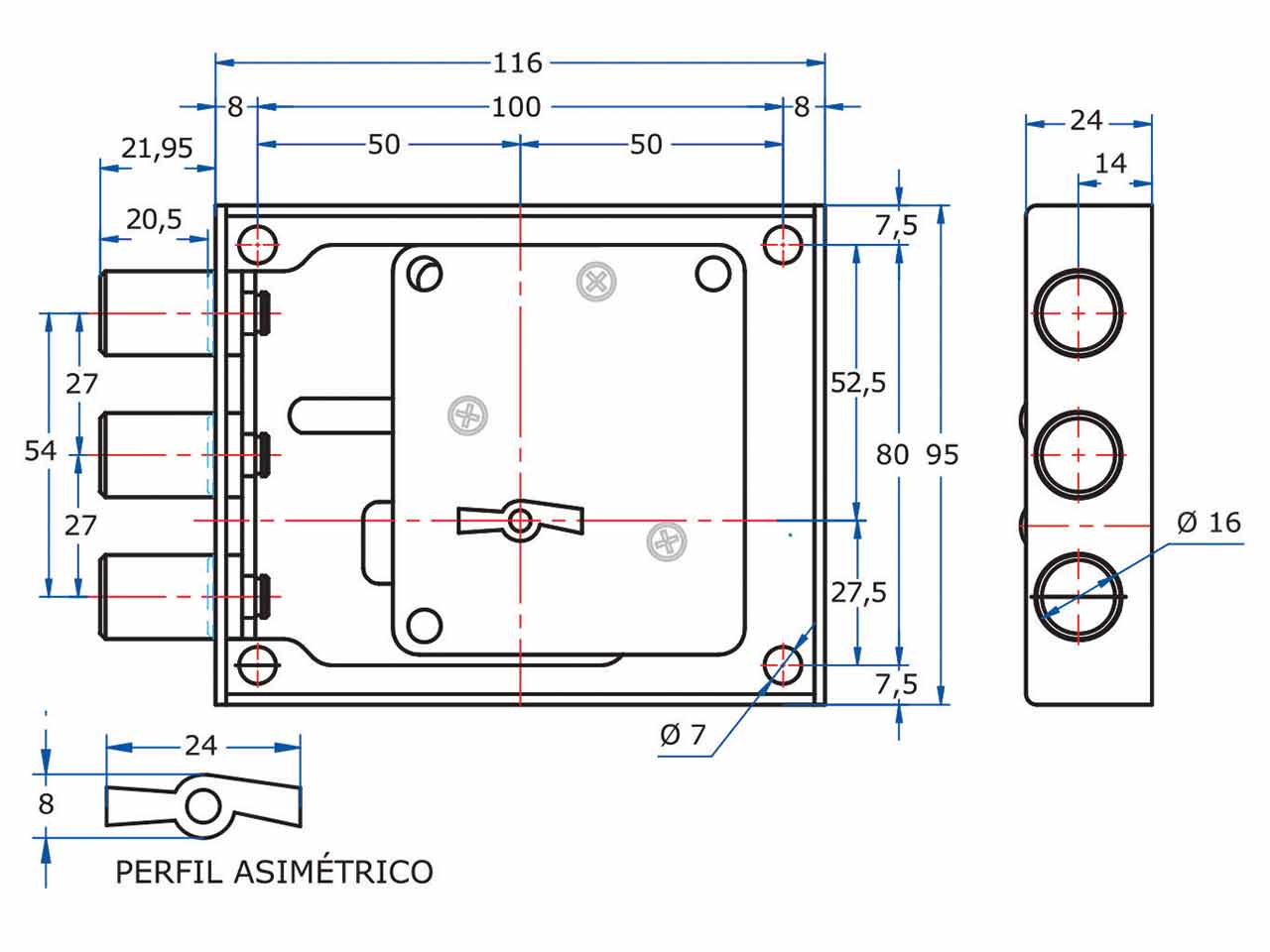 >Posibilidad de igualamiento. Recorrido de la palanca de 21 mm. con vuelta y media de llave. La llave no puede ser extraida con cerradura abierta. Se suministra con 2 llaves AGA-11G.