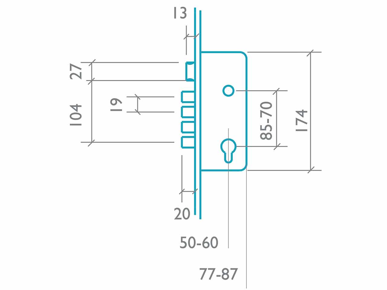 >Cerradura anti-palanca. Palancas de barras de acero. Picaporte reversible y 2 vueltas.