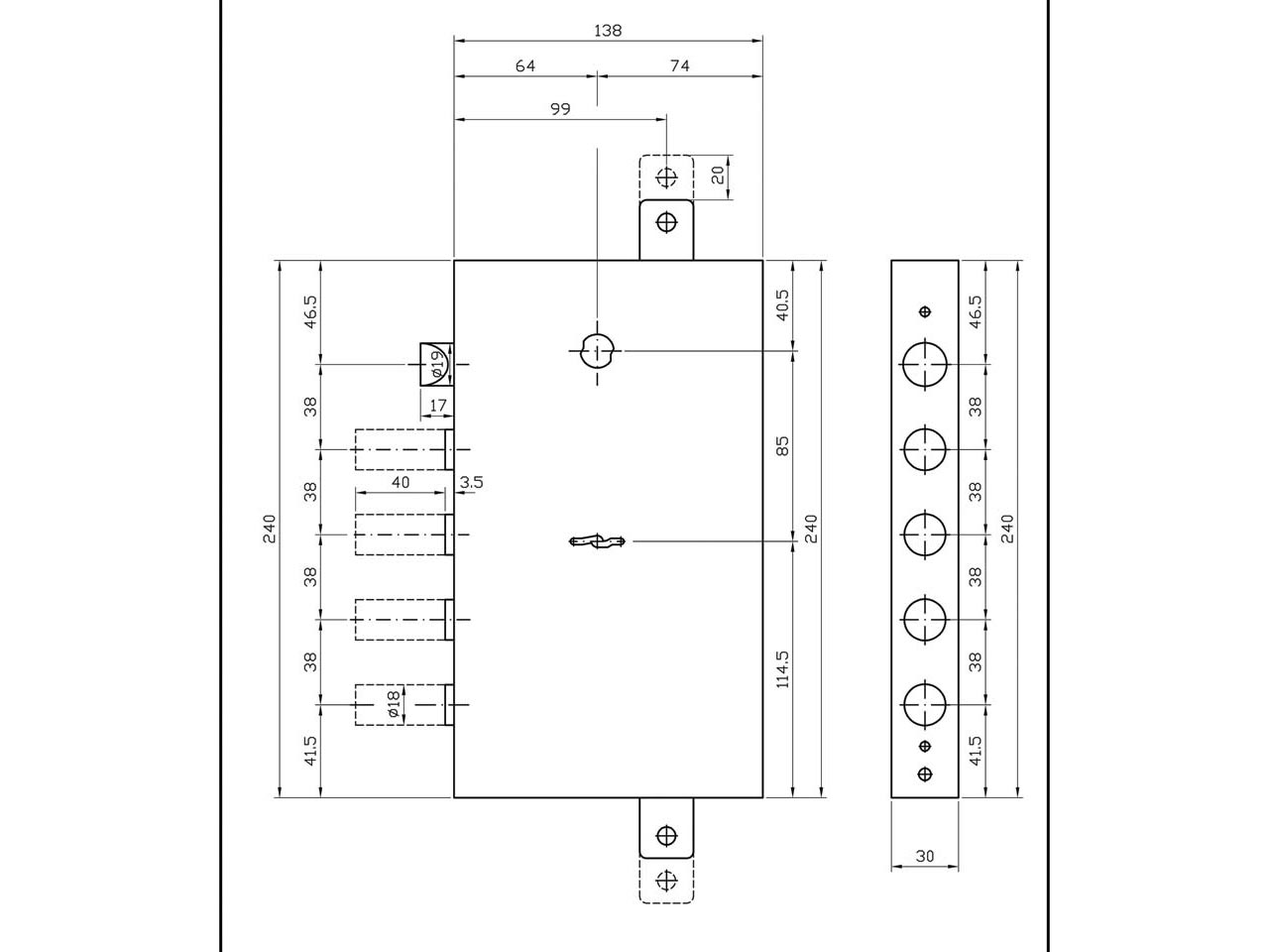 >Cerradura anti-palanca. Palancas de barras de acero. Picaporte reversible y 4 vueltas. Perfil 25x3mm.