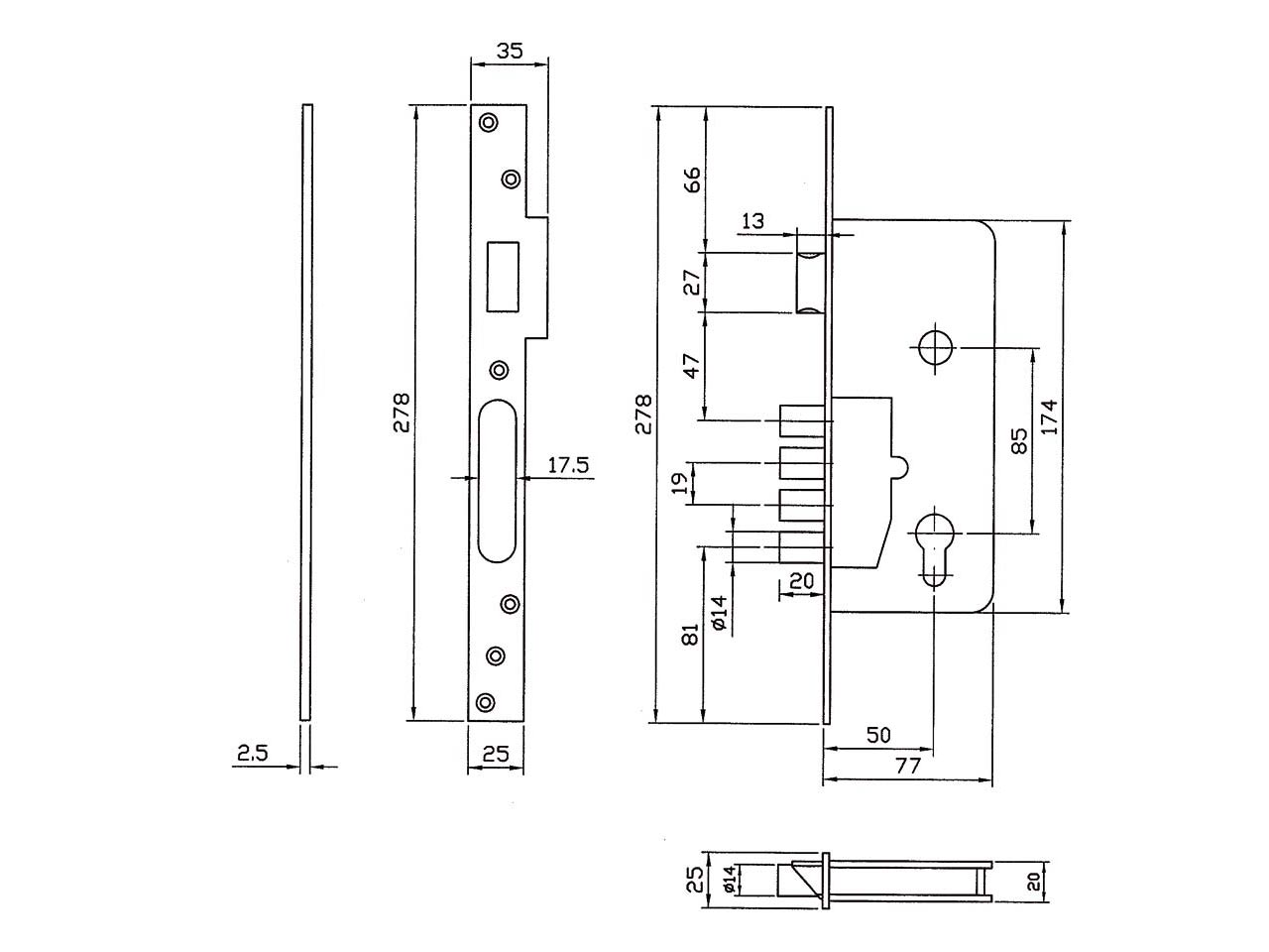>Cerradura anti-palanca. Palancas de barras de acero. Picaporte reversible 2 vueltas. Perfil 25x3mm.