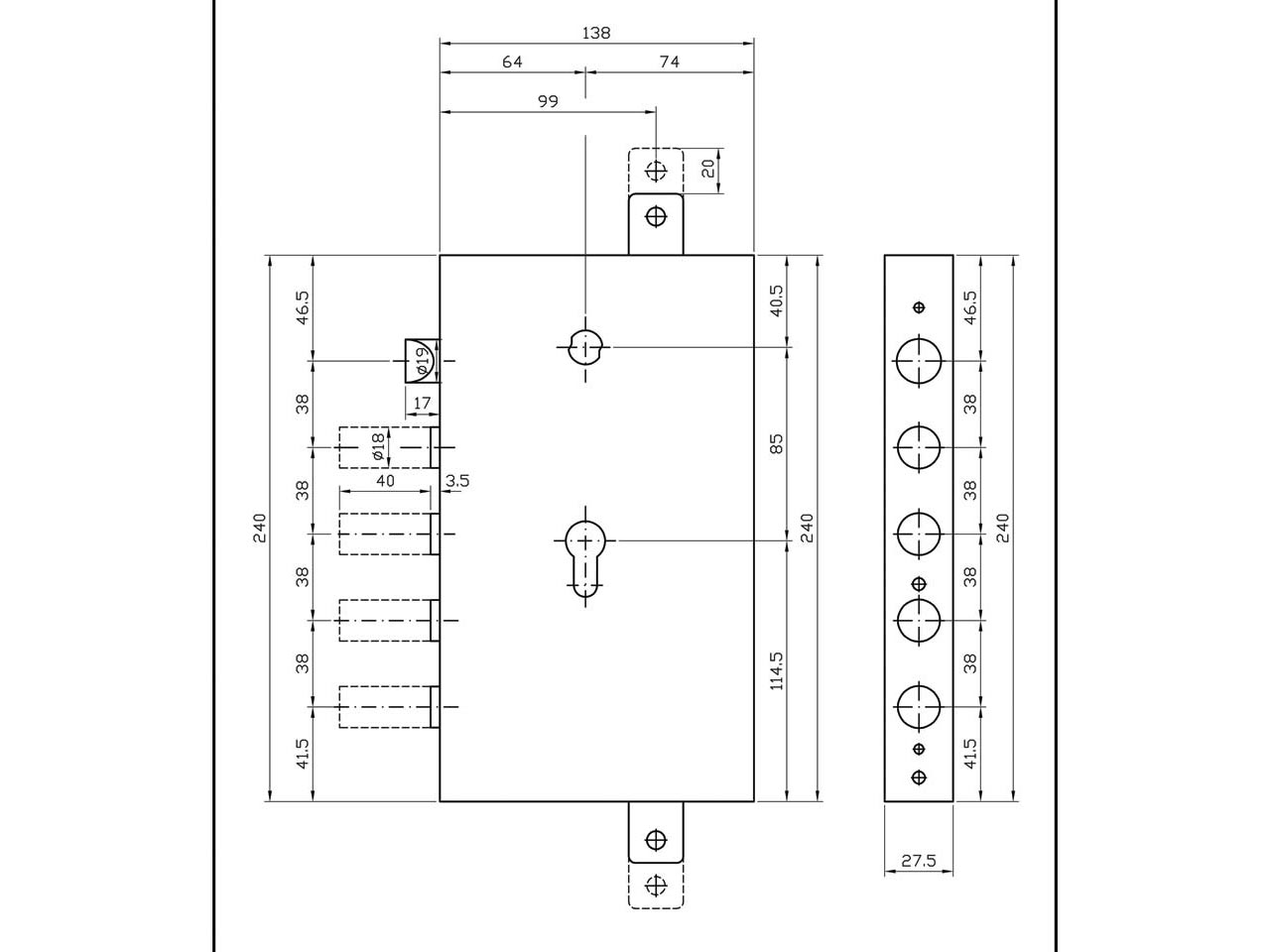 >Cerradura anti-palanca. Palancas de barras de acero. Picaporte reversible y 4 vueltas. Perfil 25x3mm.