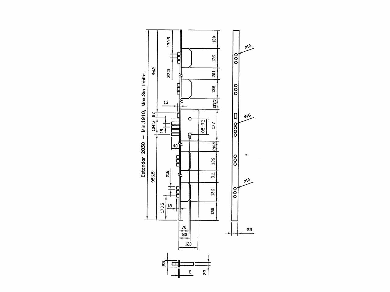 >Cerradura anti-palanca. Palancas de barras de acero de 16mm. Picaporte reversible y 4 vueltas. Escudo 424P. Cilindro DS15/60D. Perfil 25x8mm.