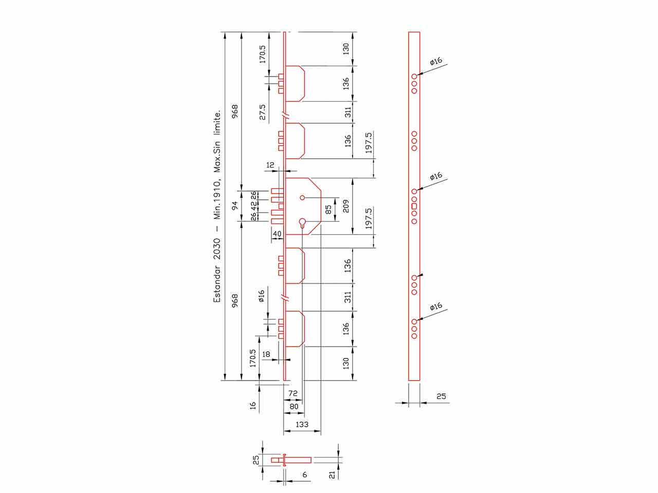 >Cerradura anti-palanca. Palancas de barras de acero de 16mm. Picaporte reversible y 4 vueltas. Escudo 424P. Cilindro DS15/60D. Perfil 25x8mm.