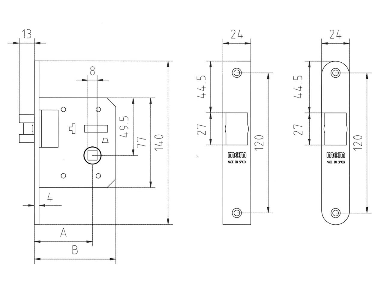>Cerrojo de seguridad con cilindro exterior, botón interior y palanca a 2 vueltas. Funcionamiento: La palanca con la llave de exterior y con el botón del interior.