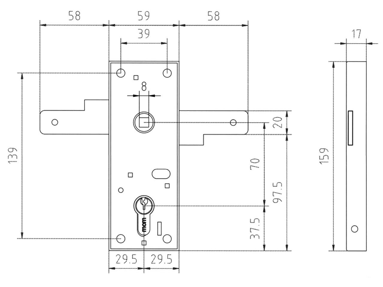 >Cerradura para puerta metálica basculante. Medio cilindro exterior, sentido vertical. Funcionamiento: Con la manilla por ambos lados. Se desbloquea con la llave por el exterior. Por el interior con el botón accionando manualmente.