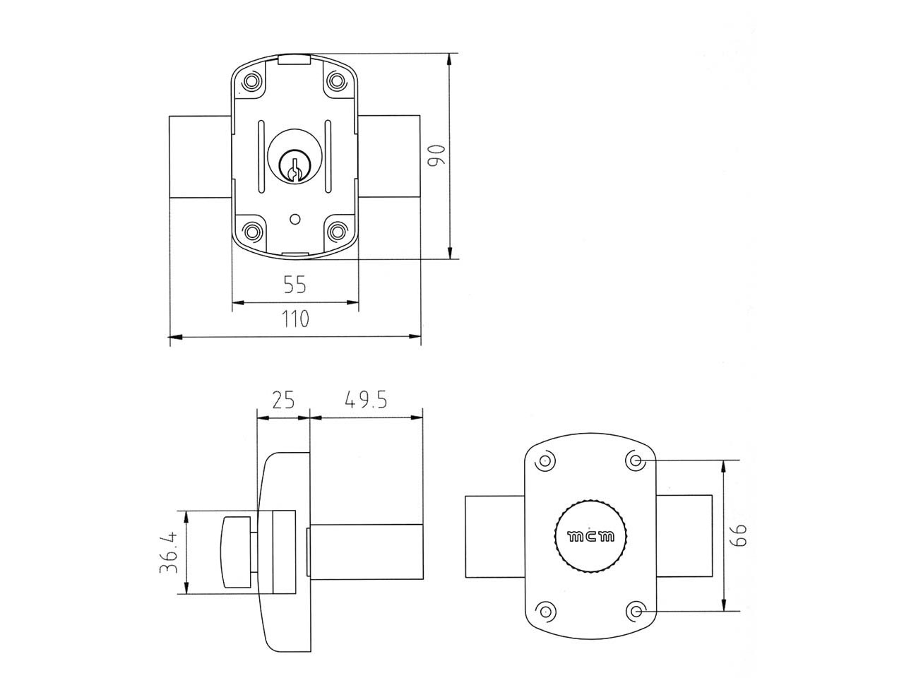 >Cerrojo de seguridad con cilindro exterior, botón interior y palanca a 2 vueltas. Funcionamiento: La palanca con la llave de exterior y con el botón del interior.