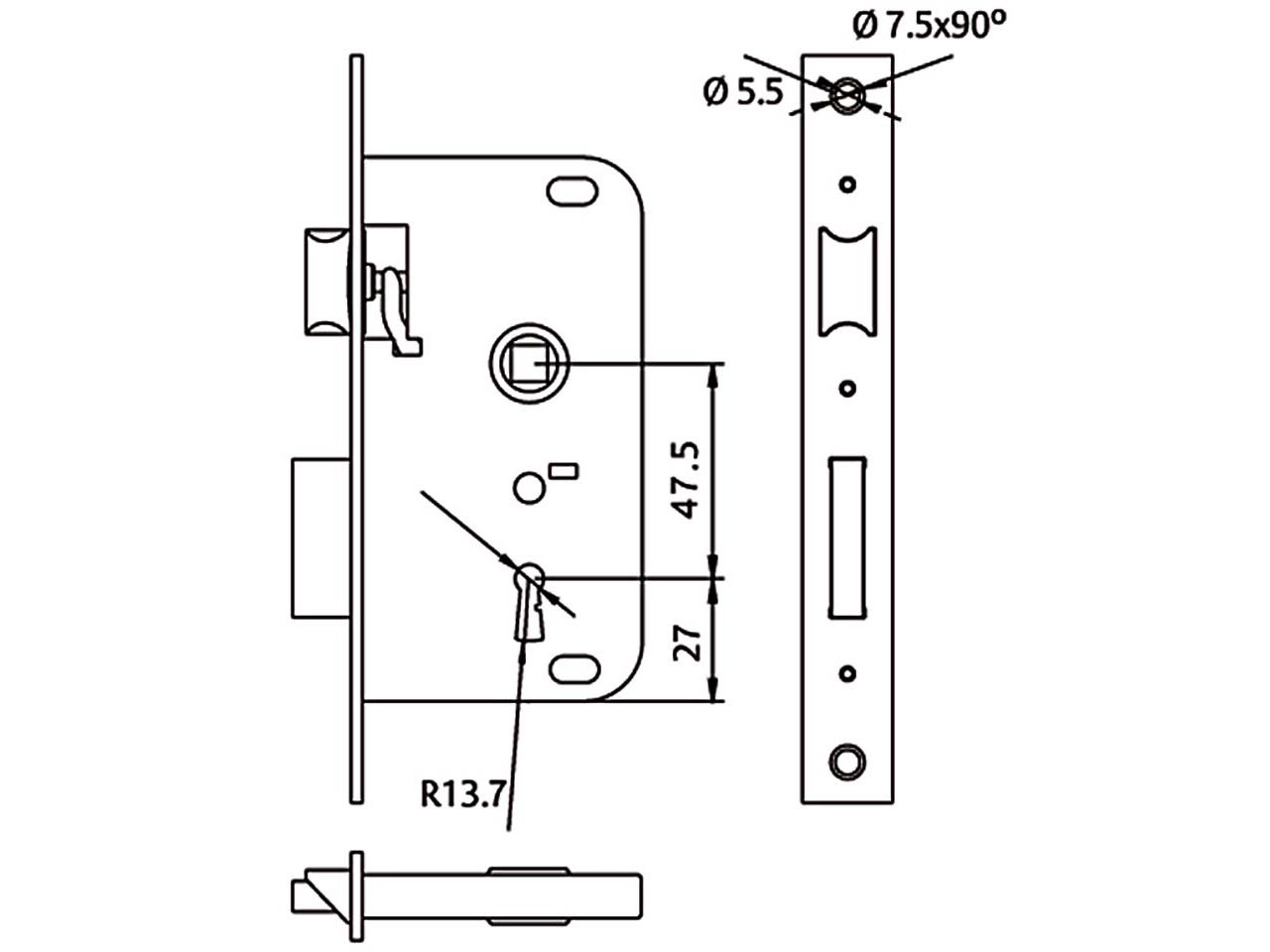 >Picaporte reversible. Nueca de 8mm. Funcionamiento: El cilindro acciona la palanca(2 vueltas) y el picaporte. La nueca acciona el picaporte.