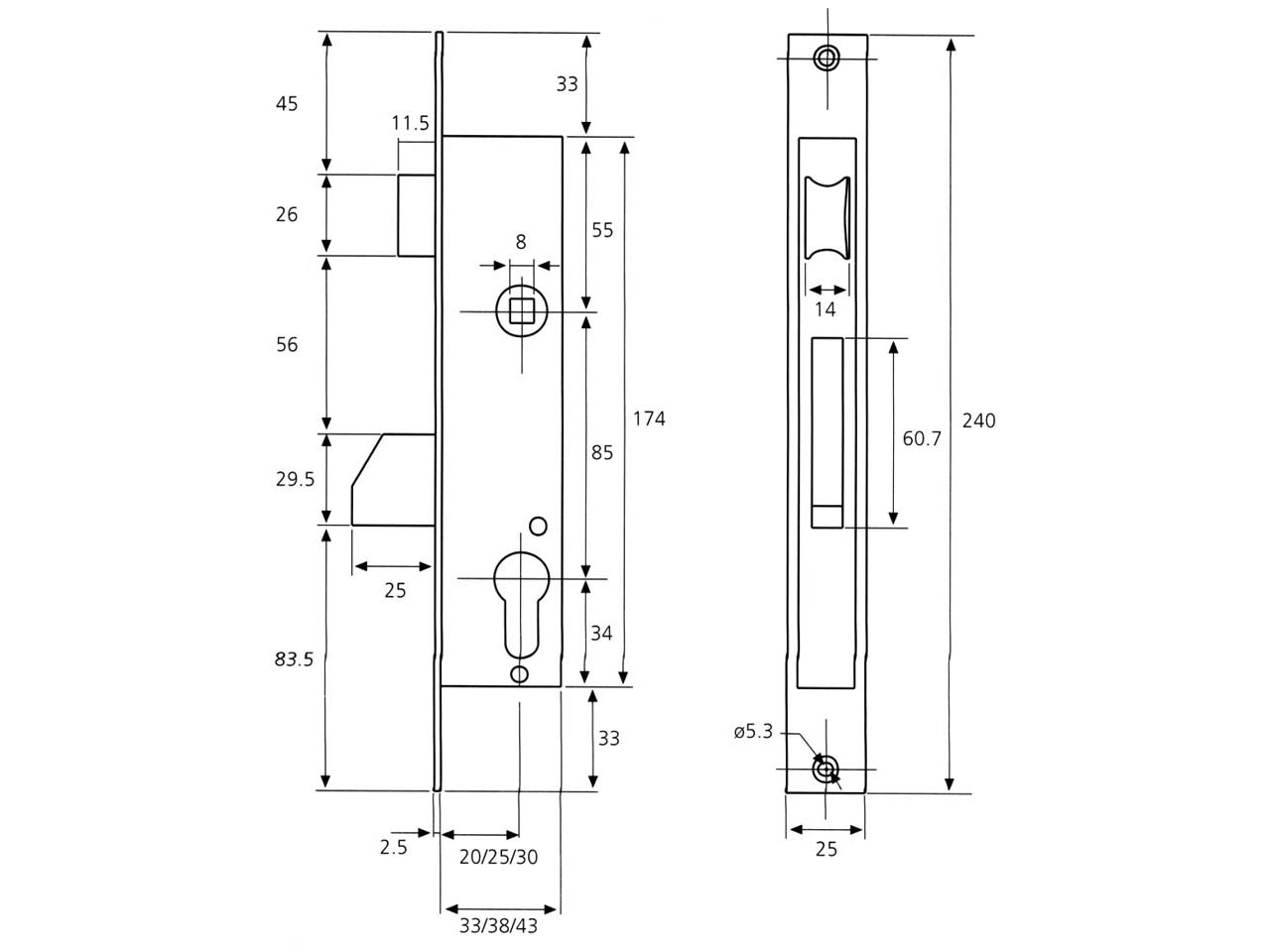 >Picaporte reversible. Nueca 8mm. Palanca basculante de 25mm. con mecanismo antipalanca. Funcionamiento: El cilindro acciona el picaporte y la palanca, la manilla acciona el picaporte.