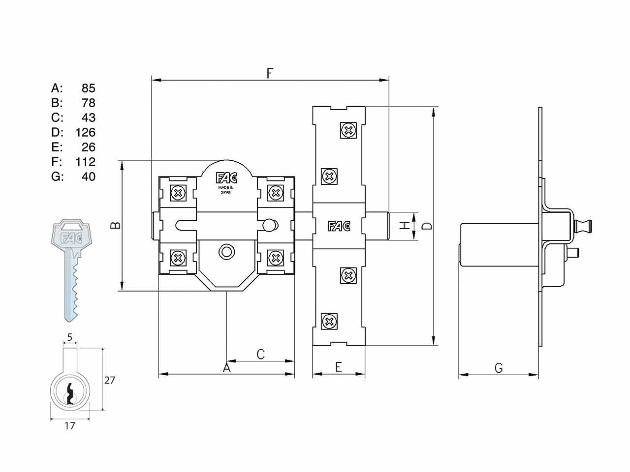 >Acabado niquelado. Barra en pletina de acero de 25x10 mm. Placa en acero de 2 mm. Cerradero en acero de 3 mm. Cilindro de latón de 40 mm. de longitud. Se acciona con la llave unicamente por la parte EXTERIOR quedando siempre la barra fija.