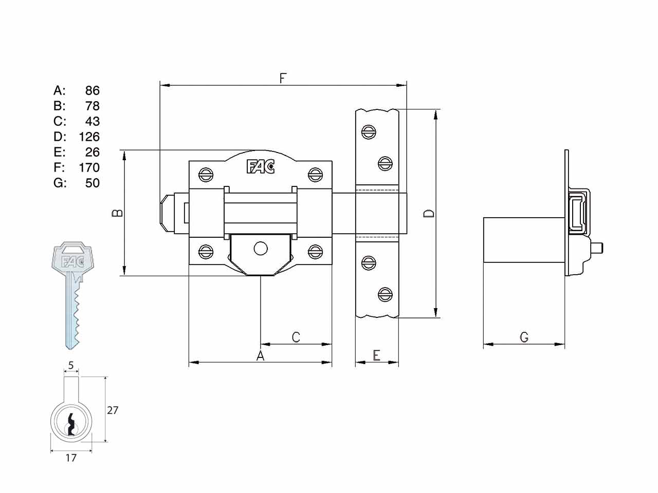>Acabado galvanizado. Barra en pletina de acero de 25x10 mm. Placa en acero de 2 mm. Cerradero en acero de 3 mm. Cilindro de latón de 50 mm de longitud. Se acciona con la llave unicamente por la parte EXTERIOR quedando siempre la barra fija.