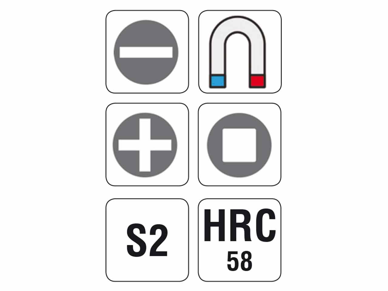>Composición Modelo (Longitud): Plana 3.0 (75 mm.), 5.0 (75 mm.), 6.0 (38 mm.), 6.0 (150 mm.), 8.0 (150 cm.). Philips PH0 (75 mm.), PH1 (75 mm.), PH2 (38 mm.), PH2 (100 mm.), PH3 (150 mm.), Cuadrado SQ1 (100 mm.), SQ2 (100 mm.)