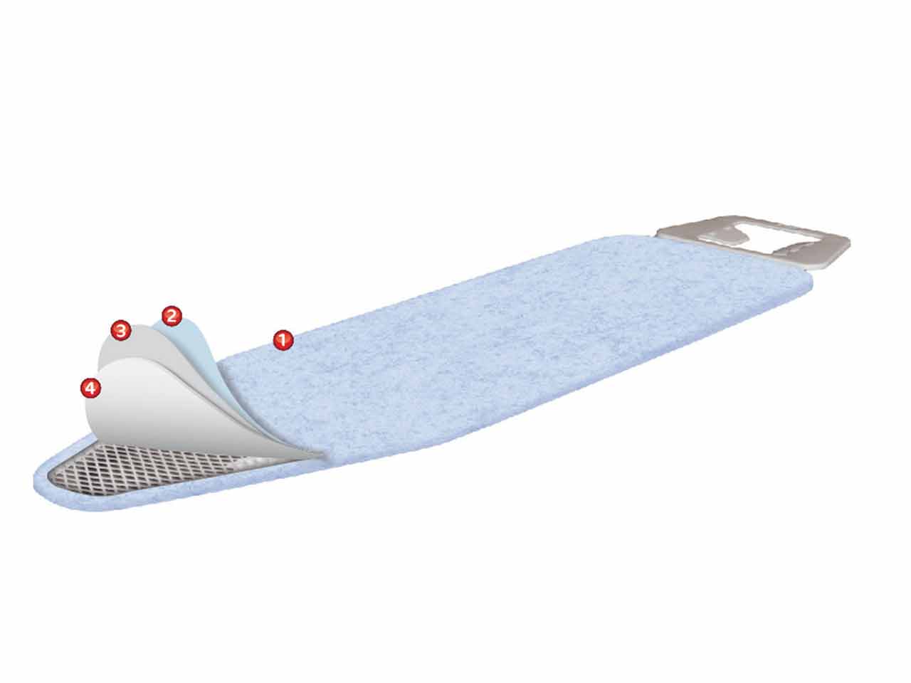 >Composición 4 capas: 1 diseños modernos estampados en colores solidos. 2 Tejido 100% algodón de 145 gr/m2. 3 Capa de espuma. 4 Capa de muletón 100% poliester. Adaptación con cordones y clip de fijación.