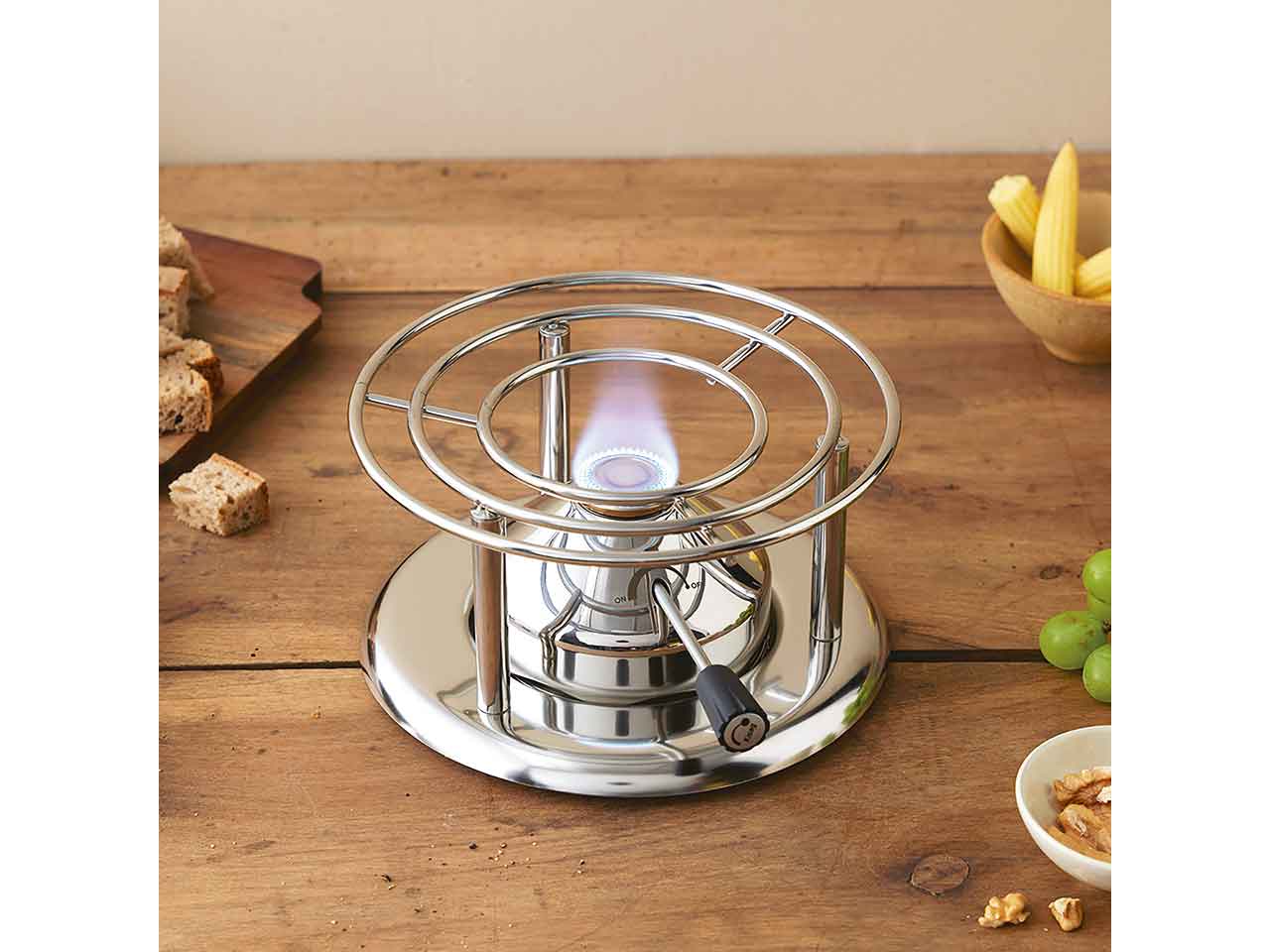 >Fabricado en acero inoxidable 18/10 de alta calidad. Elegante, de alta calidad y duradero. Caracteristicas HORNILLO: Diámetro del producto: 21 cm. Altura del producto: 10 cm. Fácil de limpiar a mano. Incluye quemador. Caracteristicas QUEMADOR: Diámetro: 11,8 cm. Altura: 7,8 cm. Tiempo de combustión: 2 horas. Potencia calorífica: 1,4 kW. Llenado: Compatible con RECARGAS PARA MECHERO compuestas de isobutano o butano y que no exceda un 30% de propano (en caso de estar presente)