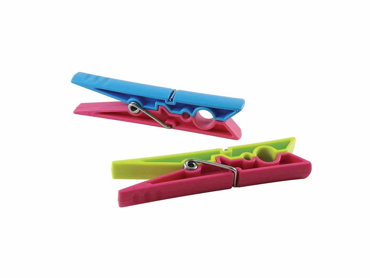 >Pinzas grandes y resistentes, ideales para todo tipo de ropa. Dimensiones: 2.51 x 3 x 8 cm. Características: Pinza de polipropileno. Muelle de acero galvanizado. Con 7 espiras. En bolsas de 20 unidades.