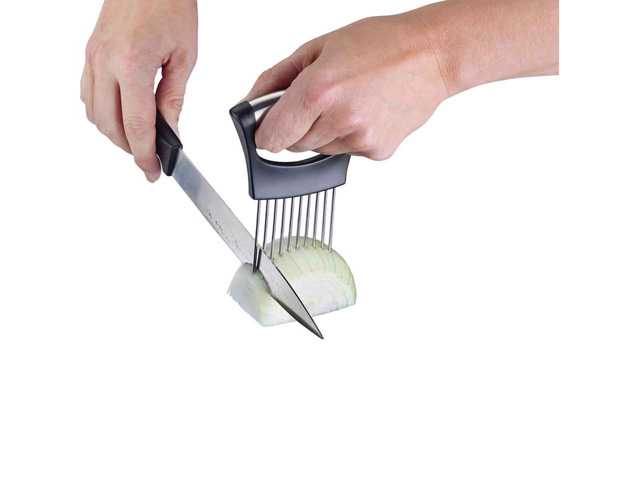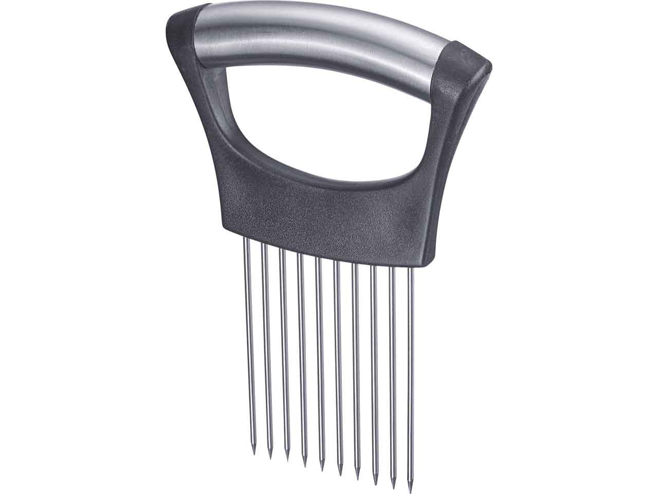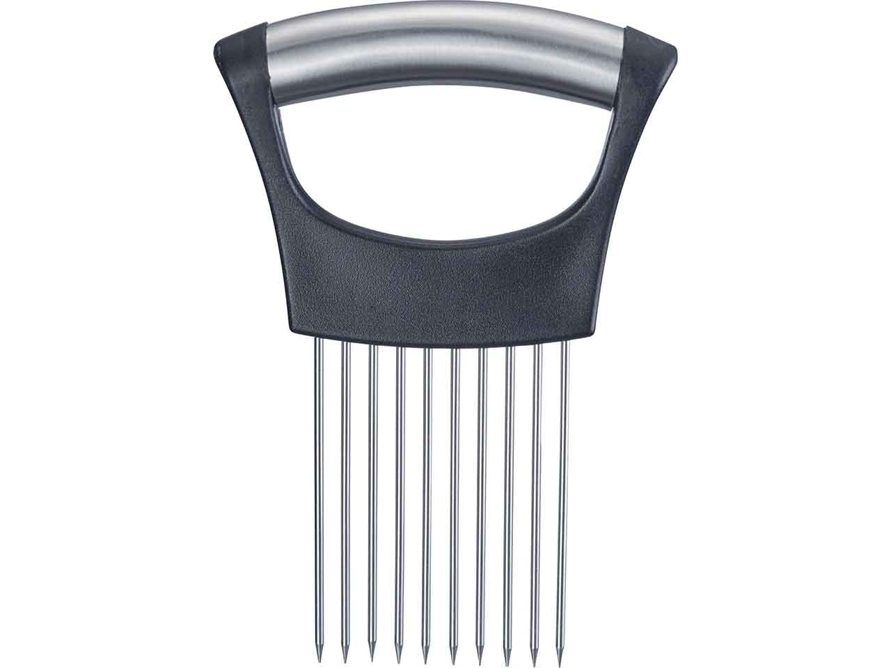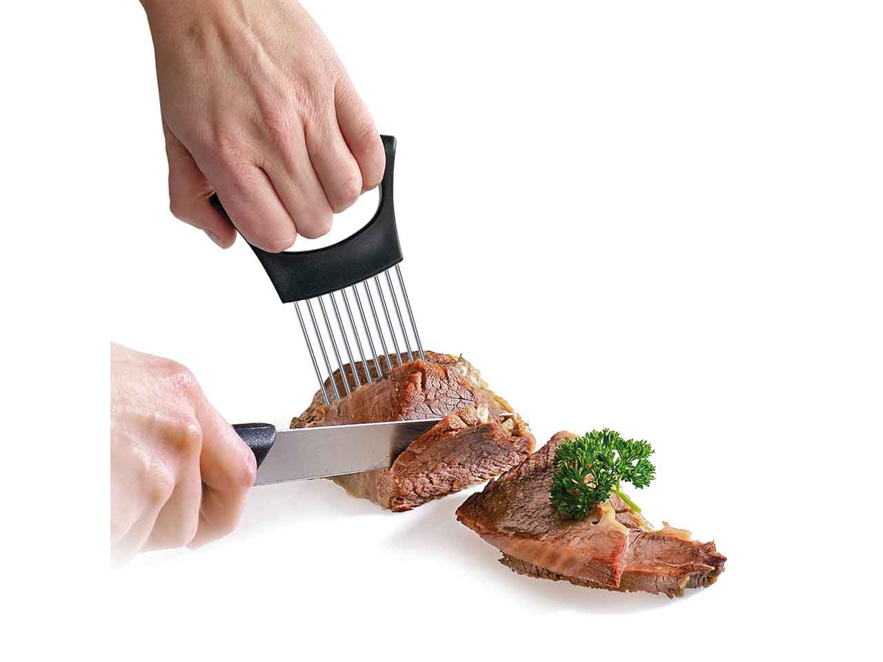 >Sujetador de restos y auxiliar de corte. Ideal para proteger los dedos al cortar asados, cebollas etc. 10 agujas puntiagudas de inox sujetan el alimento. Material: acero inoxidable 18/8; ABS. Propiedades: Apto para lavavajillas. Sín BPA