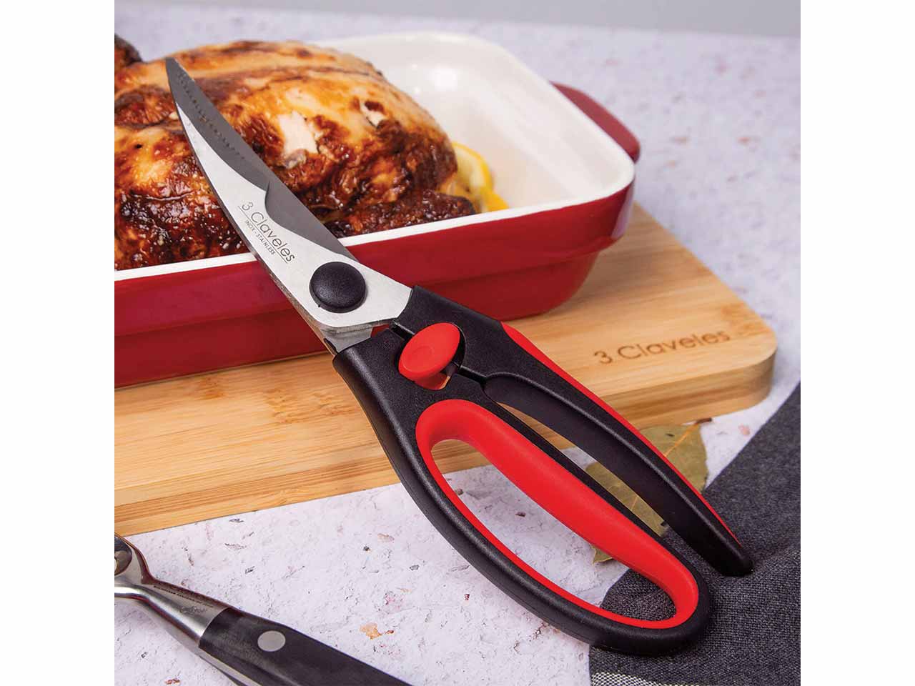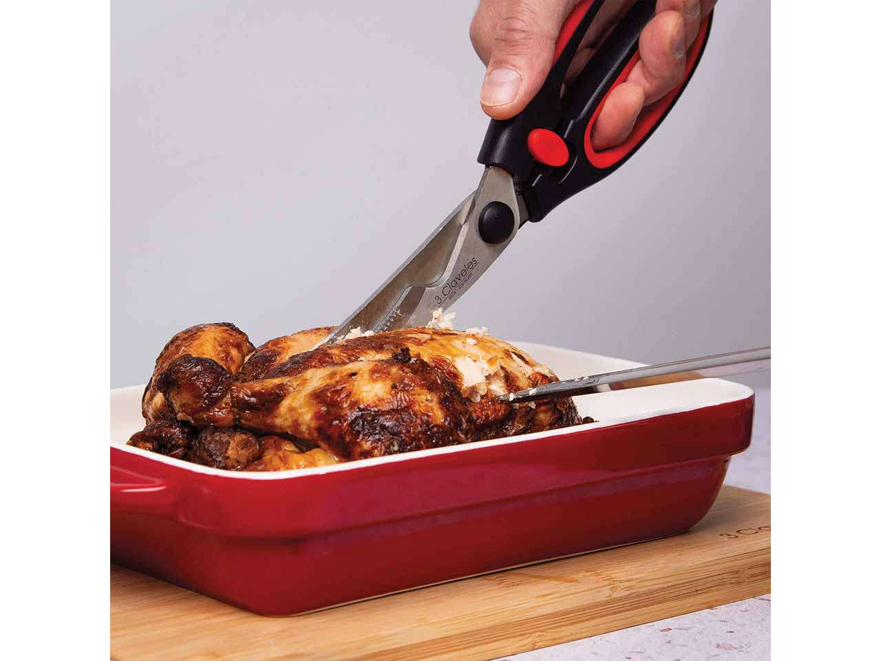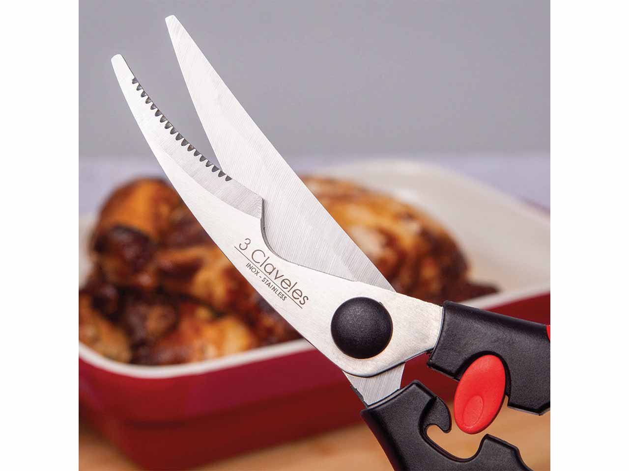 >Tijera para trinchar en acero inoxidable con mango ergonómico soft grip que facilita un agarre perfecto. Comodidad y facilidad para despiezar pollos y aves en general. Cierre de seguridad con fácil apertura. Filo dentado que permite un corte seguro y estable. Se puede lavar fácilmente con agua y jabón o en el lavavajillas para una mejor limpieza.